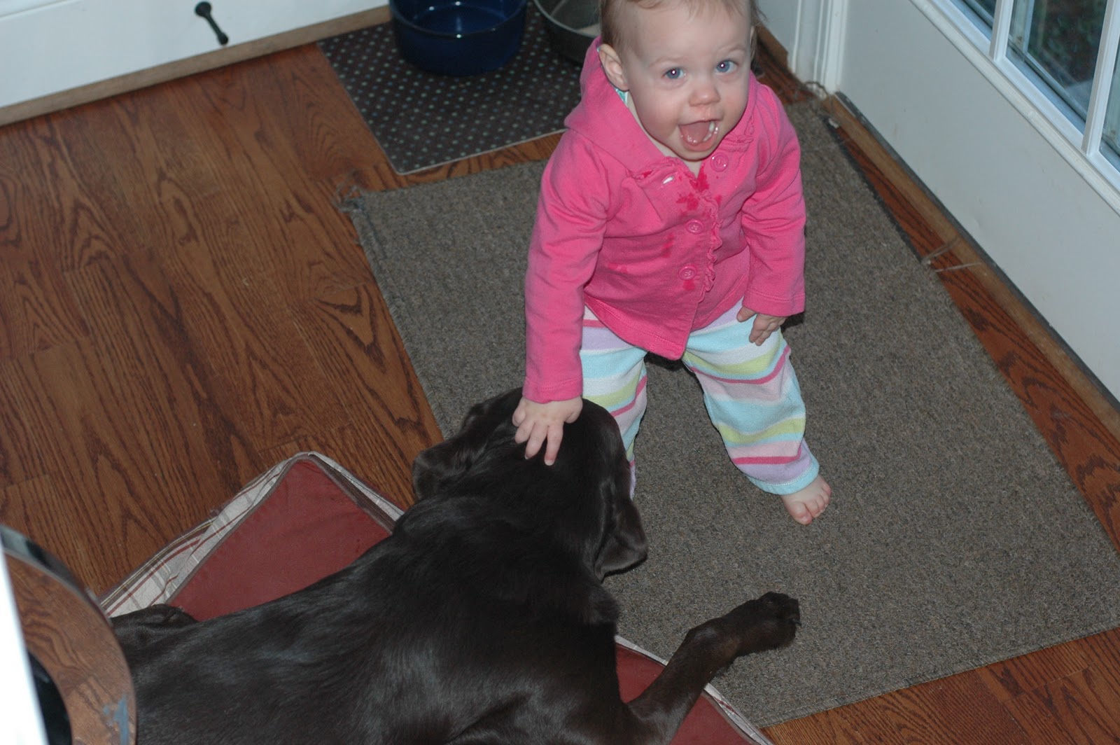 | Emerson loves Salem and loves to pet her, sit with her, give her treats, feed her a bone, throw the ball with her....and shake her finger at her and tell her 'bad dog,' we don't know where she learned that one... |